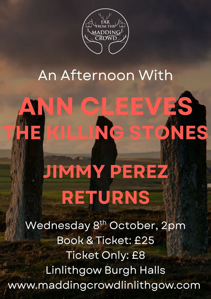 Ahead of next Wednesday's event with Ann Cleeves, a reminder that the venue has been changed to the Linlithgow Burgh Halls due to circumstances outwith our control.