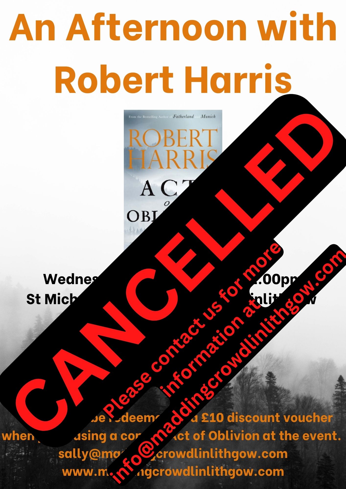 We're very sorry to announce that Robert Harris has been forced to cancel this leg of his national tour as he's contracted covid. This means his scheduled event in Linlithgow on Wednesday 28th September cannot go ahead as planned. We are doing our best to reschedule the event, but if you have bought a ticket and you would like a full refund, then please contact us (details below) and we will refund you. As soon as we know if we are able to reschedule this event, we will make an announcement, but apologies again: we're gutted! Many thanks, Sally and the team. T: 01506 845509 E: info@maddingcrowdlinlithgow.com Or pop into the shop.