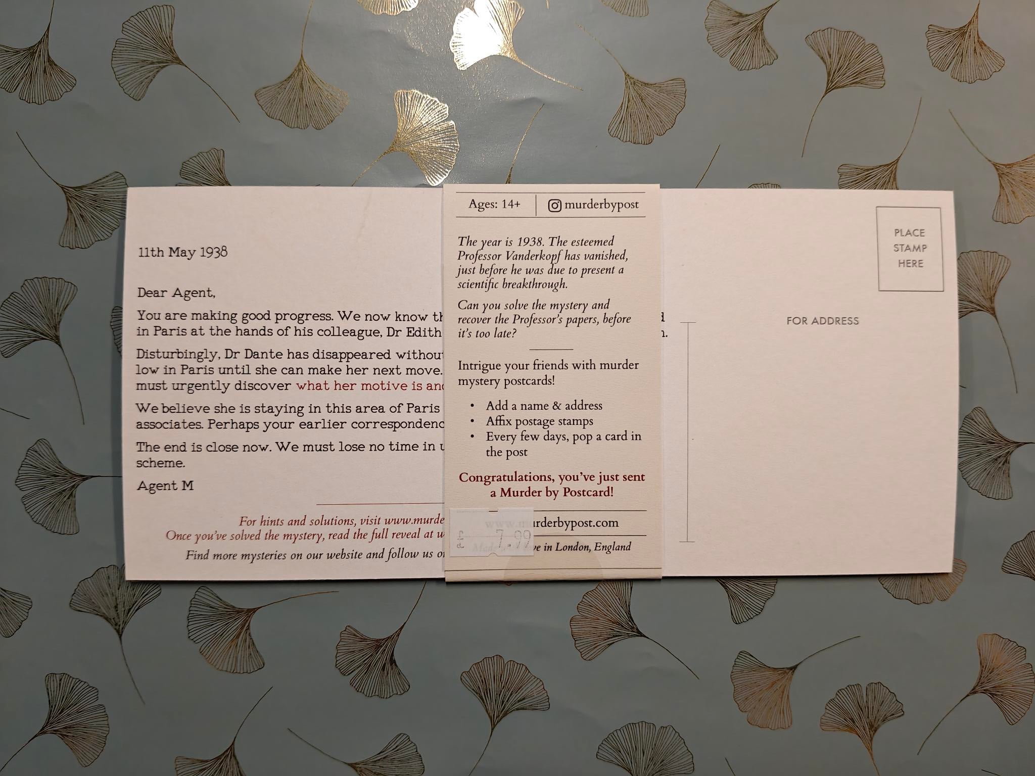 This mini murder mystery is made up of four beautiful vintage-style postcards. They are a perfect way to intrigue and perplex a friend! Simply: