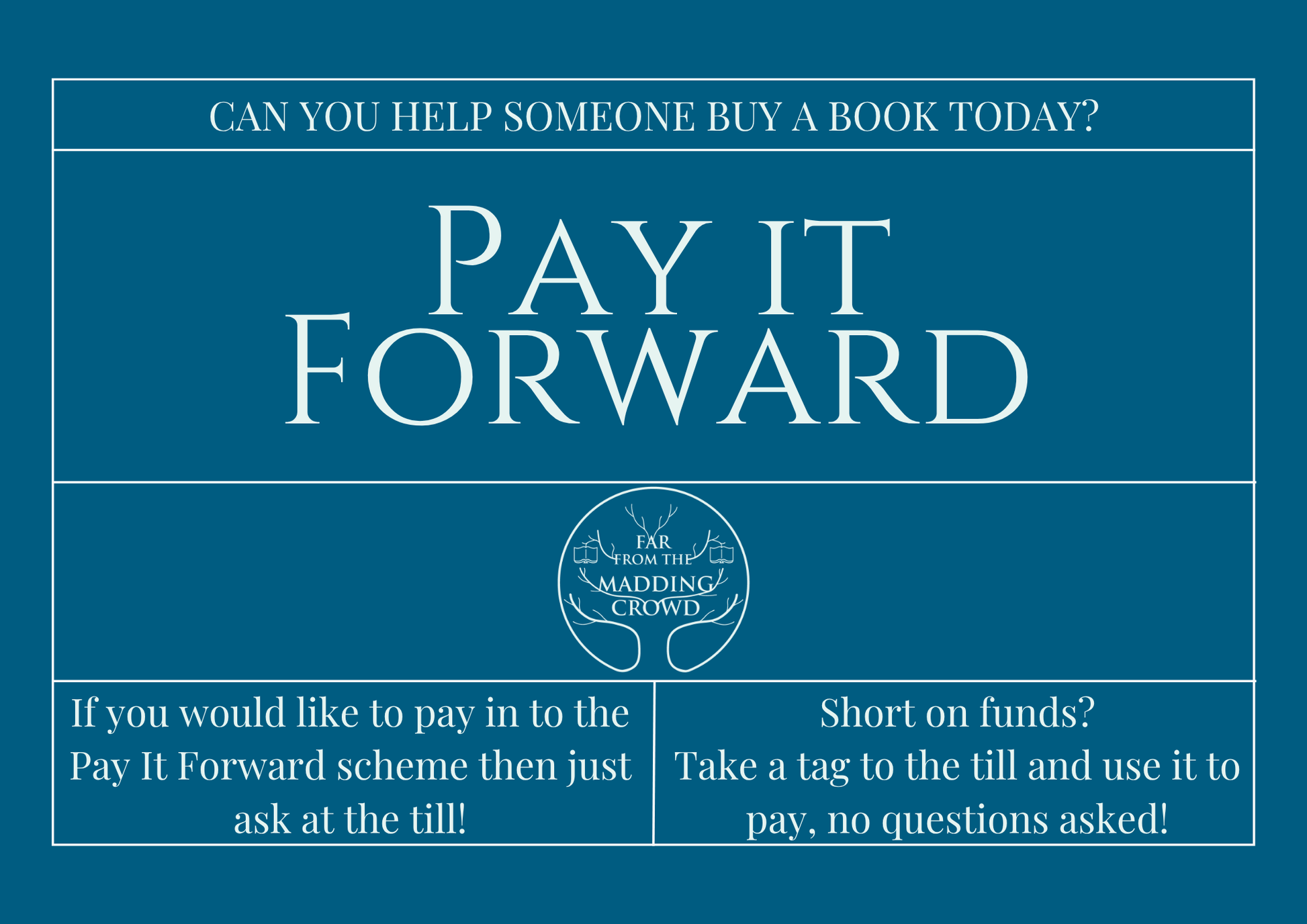 Any customers who can afford to can donate money to the scheme, and then anyone who needs a bit of extra help paying for their books can take one of our Pay It Forward tags to the till and use it towards their purchase, no questions asked!